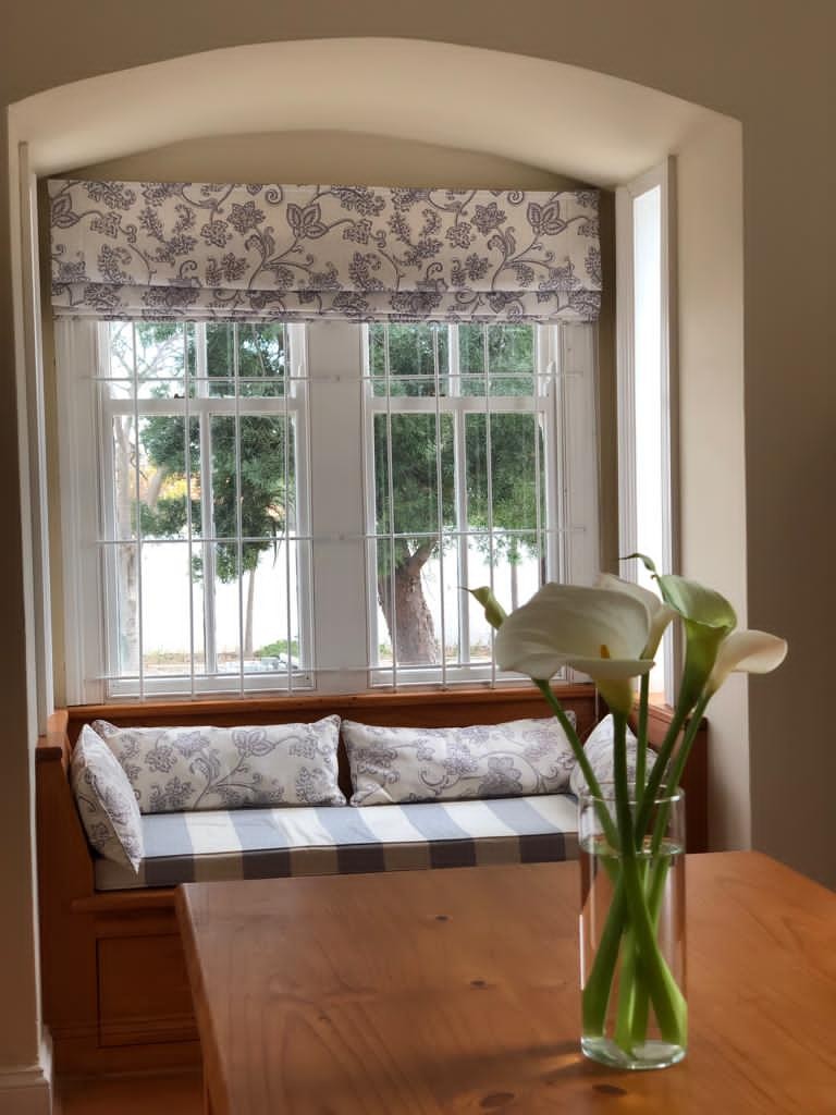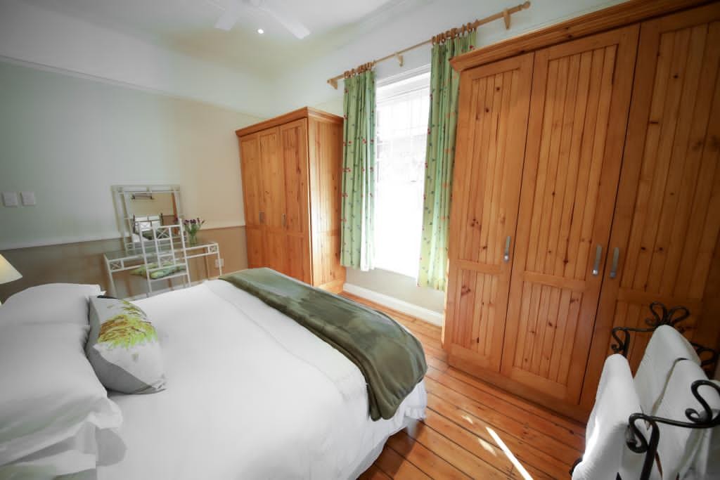 The spacious living room has a fireplace for chilly winter nights. It has two French doors that open to the patio. The area is tastefully furnished with a leather couch, wingback chairs and beautiful prints and paintings on the walls. There is a six-seater dining room table with chairs. We have a book shelf stocked with books and games and a TV with Dstv as well as a desk and chair .