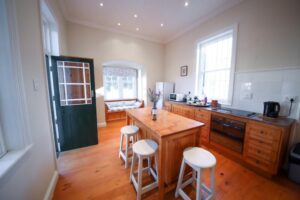 The kitchen is fully fitted. It has a stove, microwave oven and dishwasher. We have MasterChef pots and pans and all the culinary equipment you will need in order to prepare a meal. This area is spacious with bar stools and a sitting nook in the bay window overlooking the garden. Cats Whiskers is self-catering. We do provide coffee, tea, rusks and a sweet treat!
