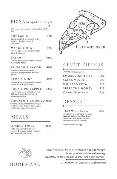 Neapolitan style pizzas, loaded fries, crust dipper sauces, and dessert.