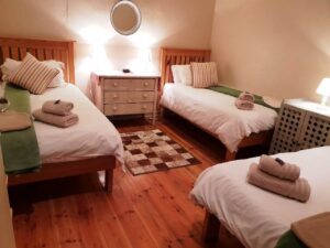 Queen size bed + 2 single beds in OPEN-PLAN set-up.