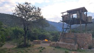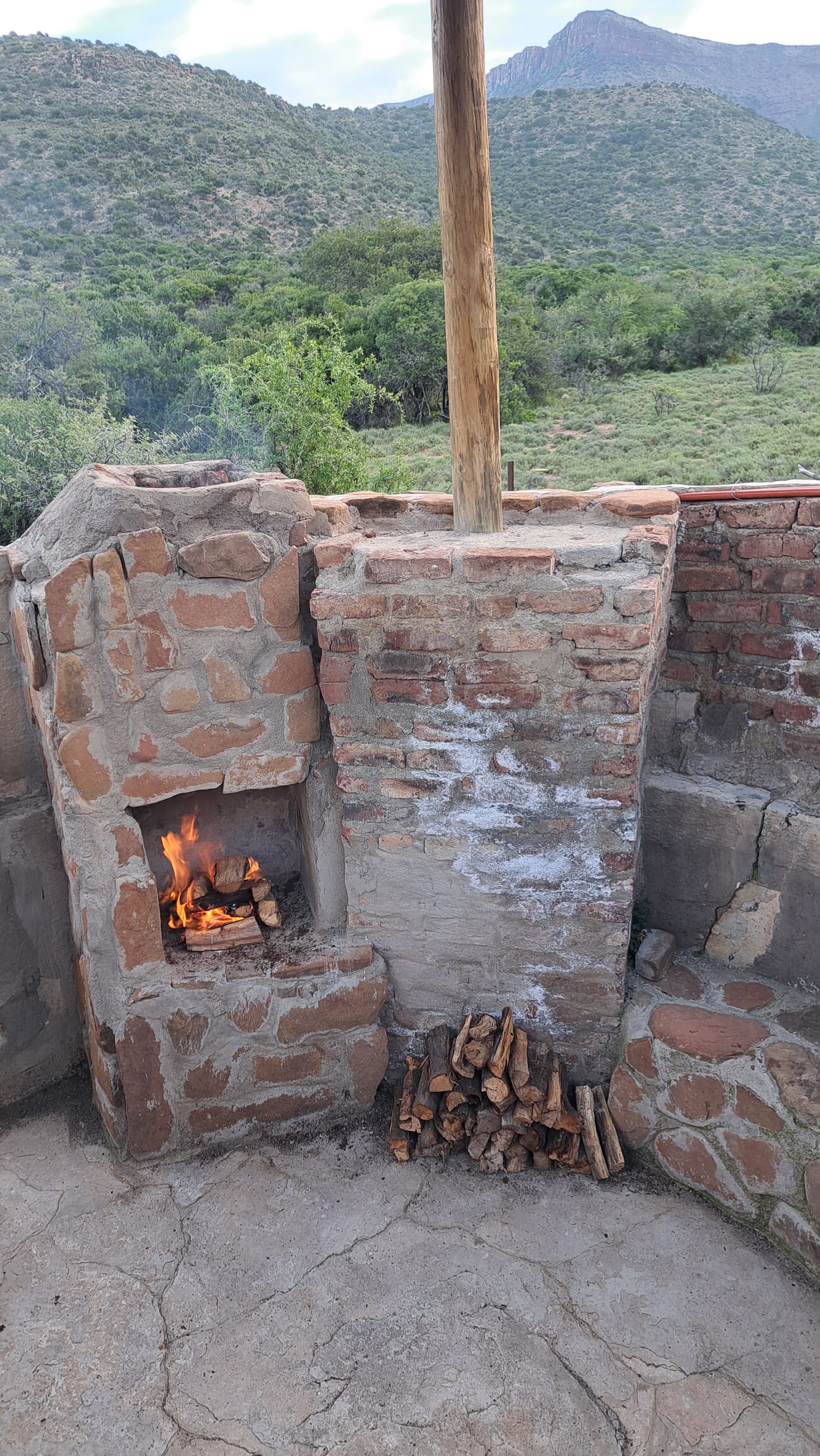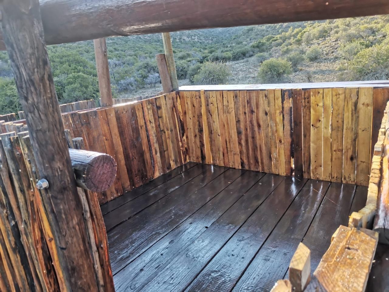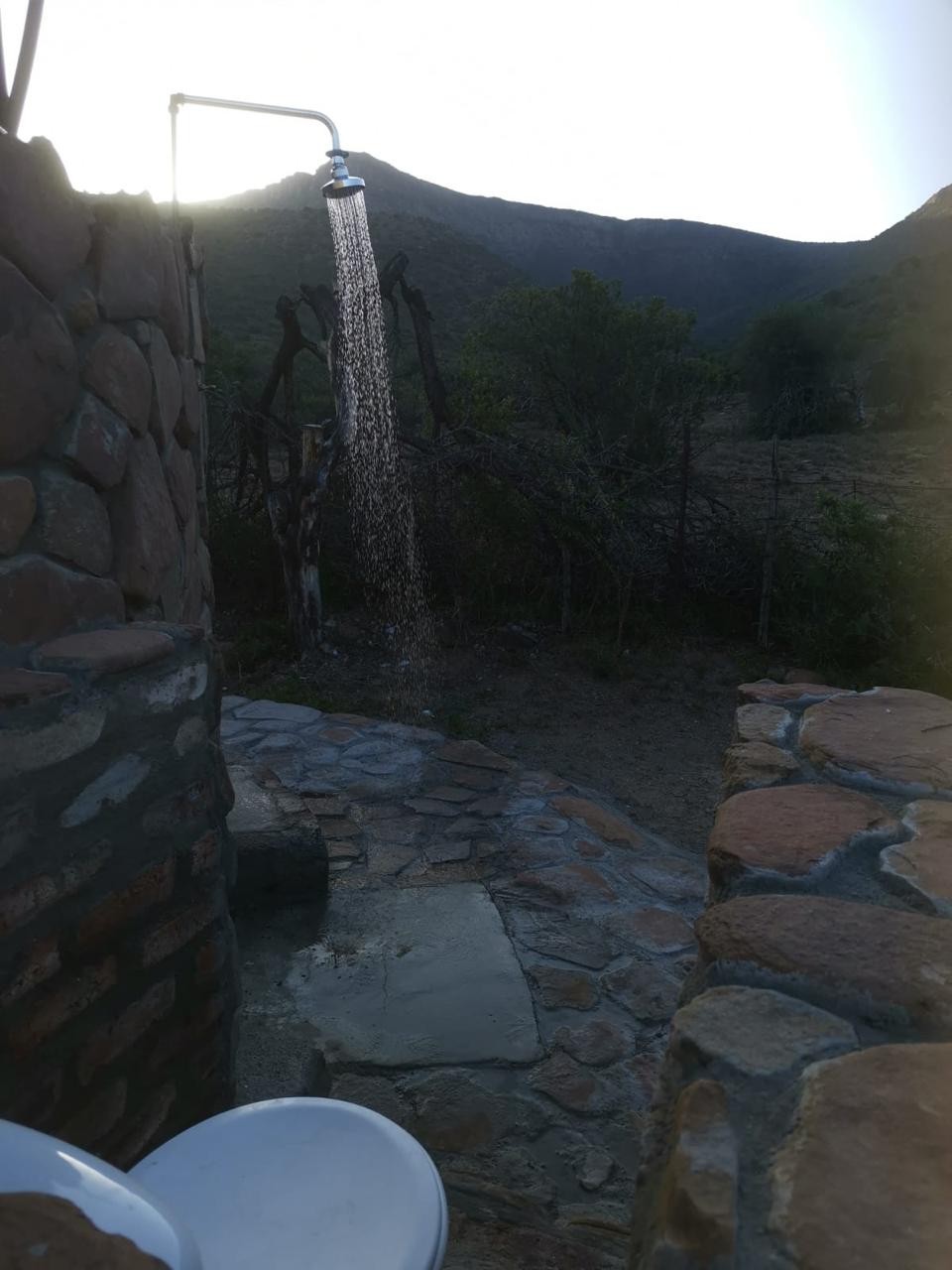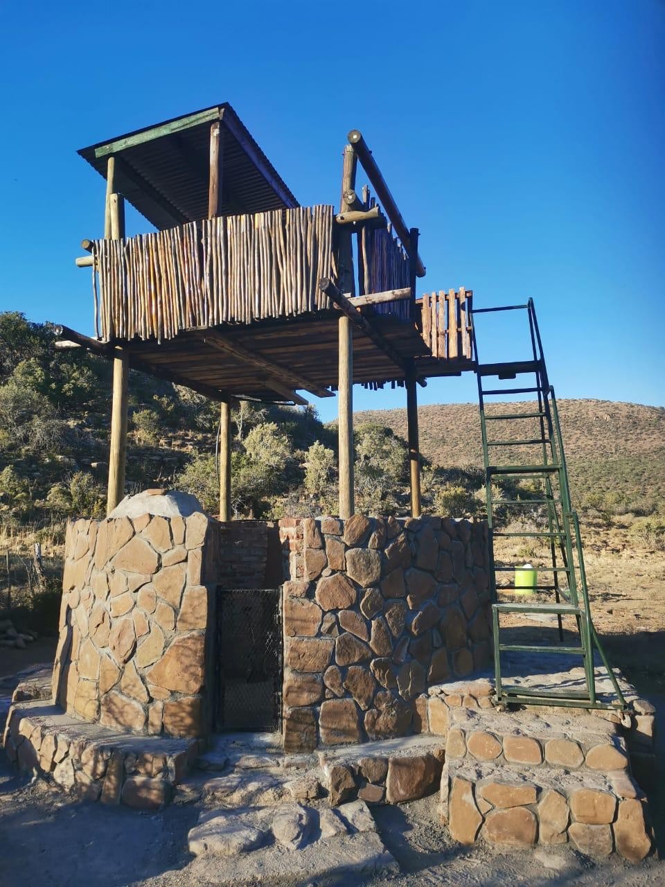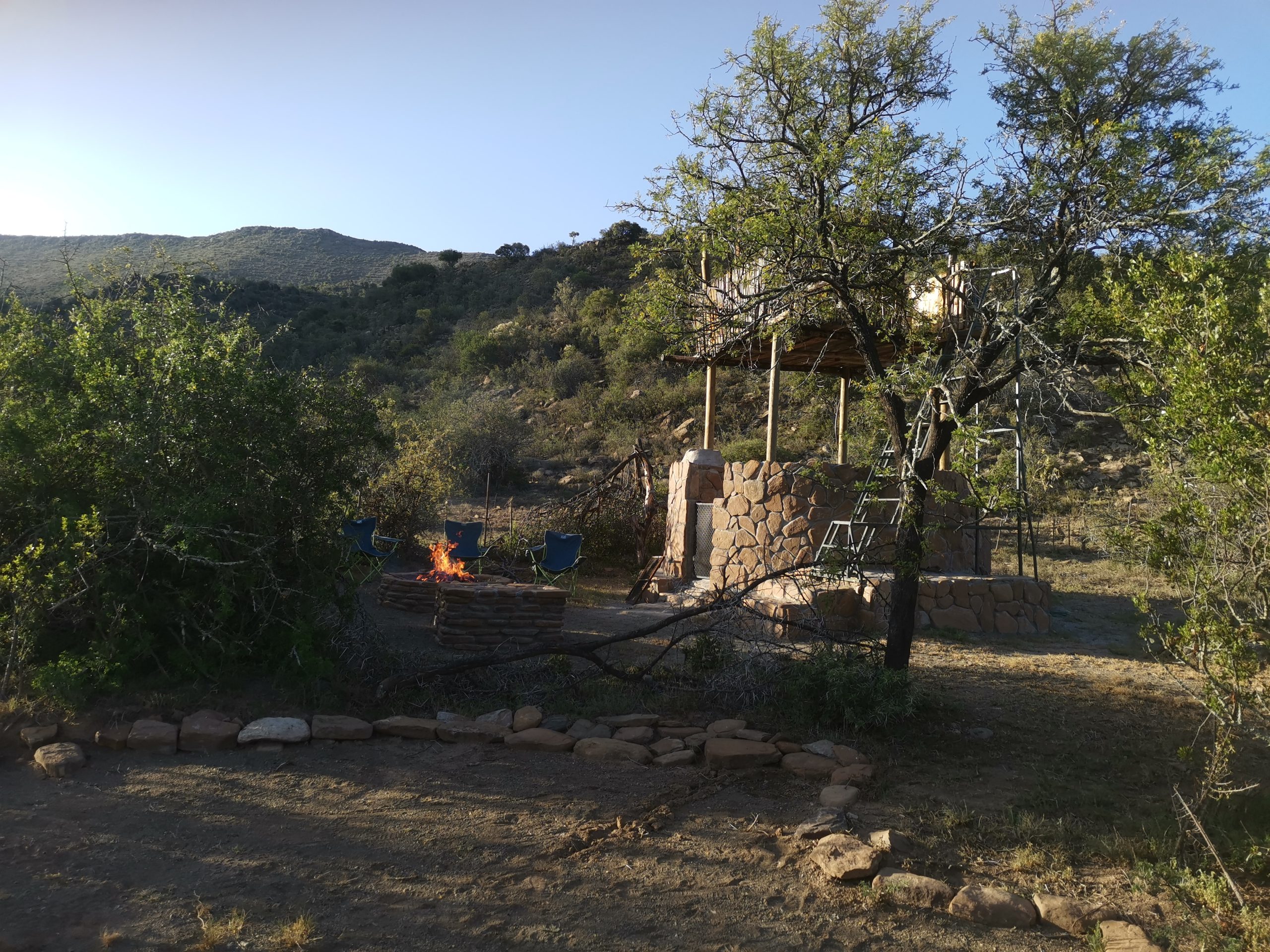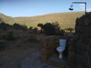 There is water and a flush toilet. The shower has mostly cold water. There is a level camping area and a deck which can be used for sleeping. Small enclosed boma, with a braai and also outside braai area.