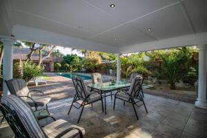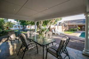 Situated in lovely quiet area, each room has its own patio with table and chairs overlooking well-maintained garden.
