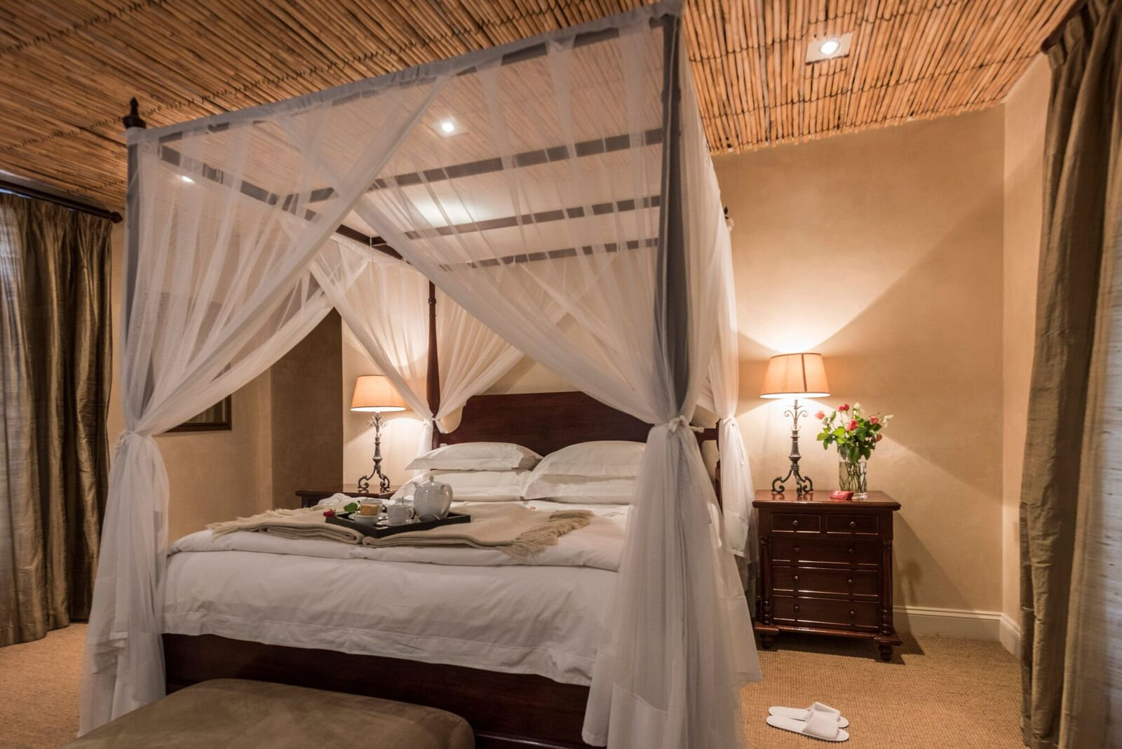 • Courtyard (4 Suites): Courtyard is a gracious, double-gabled intimate homestead, encircled by a deep veranda that overlooks spacious gardens and a swimming pool. Comprising four tastefully appointed en-suite bedrooms (3x double and 1x twin), it lends itself to a more relaxed safari approach. It is ideal as an exclusive use villa for groups or family and friends traveling together. Rooms feature air-conditioning, under-floor heating, a mini bar with tea/ coffee making facilities and French doors opening on to the gardens. Bathrooms feature double vanities, a shower, bath and WC.