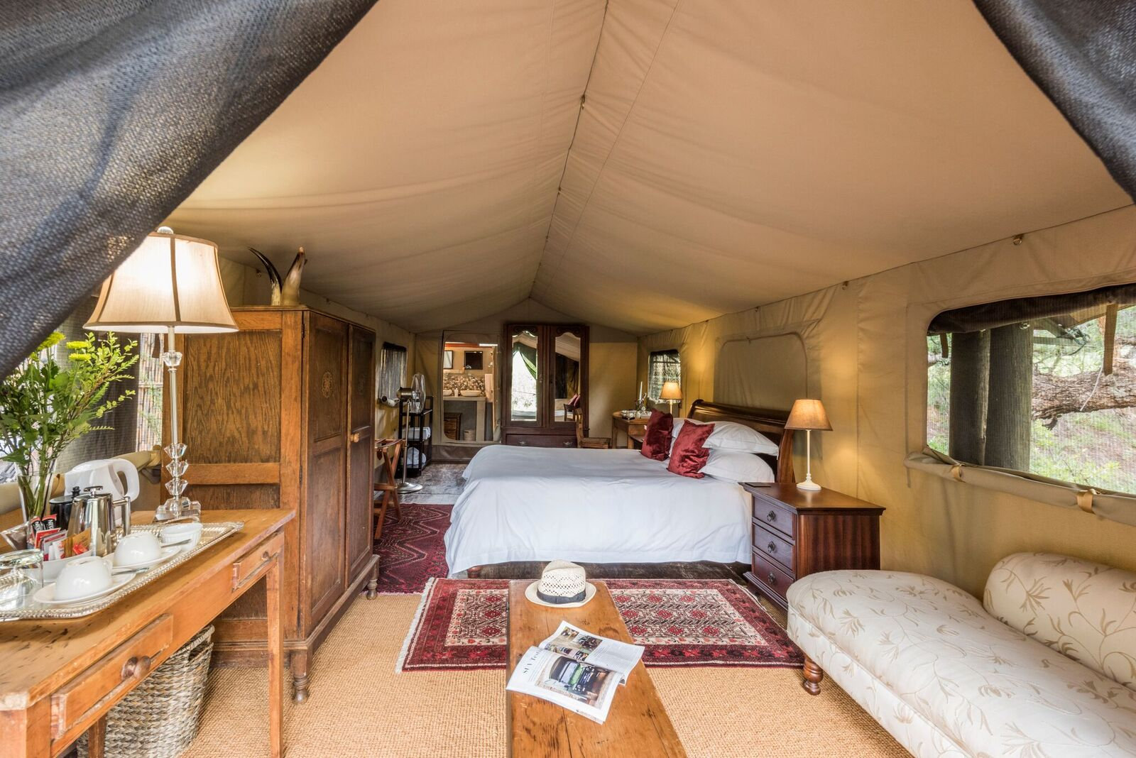 Mount Camdeboo Private Game Reserve rests at the foot of the majestic Sneeuberg Mountain Range in South Africa’s dynamic Karoo region. This is a place of sweeping panoramas and undulating escarpments, extraordinary plant and animal diversity, and a deeply rooted cultural heritage – from its early Bushmen dwellers to its Dutch settlers. The reserve’s pristine 14,000 hectares traverse a myriad of habitats: thorn scrub valleys and succulent hillsides, plunging gorges and vast mountain grasslands teeming with game. Mount Camdeboo’s commitment to the continued restoration and preservation of this important region through sustainable eco-tourism, along with the desire to demonstrate authentic Karoo hospitality in a relaxed and elegant setting, makes it a destination for thoughtful and discerning travelers. If wildlife is what you’re after, Mount Camdeboo contains an impressive spectrum. The reserve is home to white rhino, Cape buffalo, cheetah, giraffe, mountain zebra, a host of antelope and an abundance of birds. If remote R&R is what you need, then the on-site spa and the constantly evolving menu of wholesome, locally inspired, refined cuisine, will do wonders for body and soul. Accommodation is in three beautifully restored, gracious gabled manors – including a sole-use villa – each with spacious gardens and swimming pools, and one with an additional secluded cottage. For those looking for something under canvas, two luxurious and privately located en-suite safari tents provide sweeping views over the reserve.