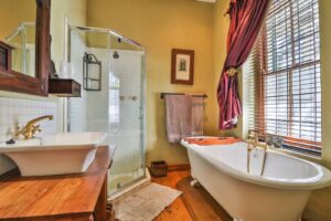 Room 5 is wheel-chair accessible, has an en-suite bathroom with a bath with hand-rails and a shower with seating and hand rails. There is also a raised toilet and accessible wash basin. There are 2 extra-length beds in the bedroom. Parking next to room is provided, with no steps into the room.
